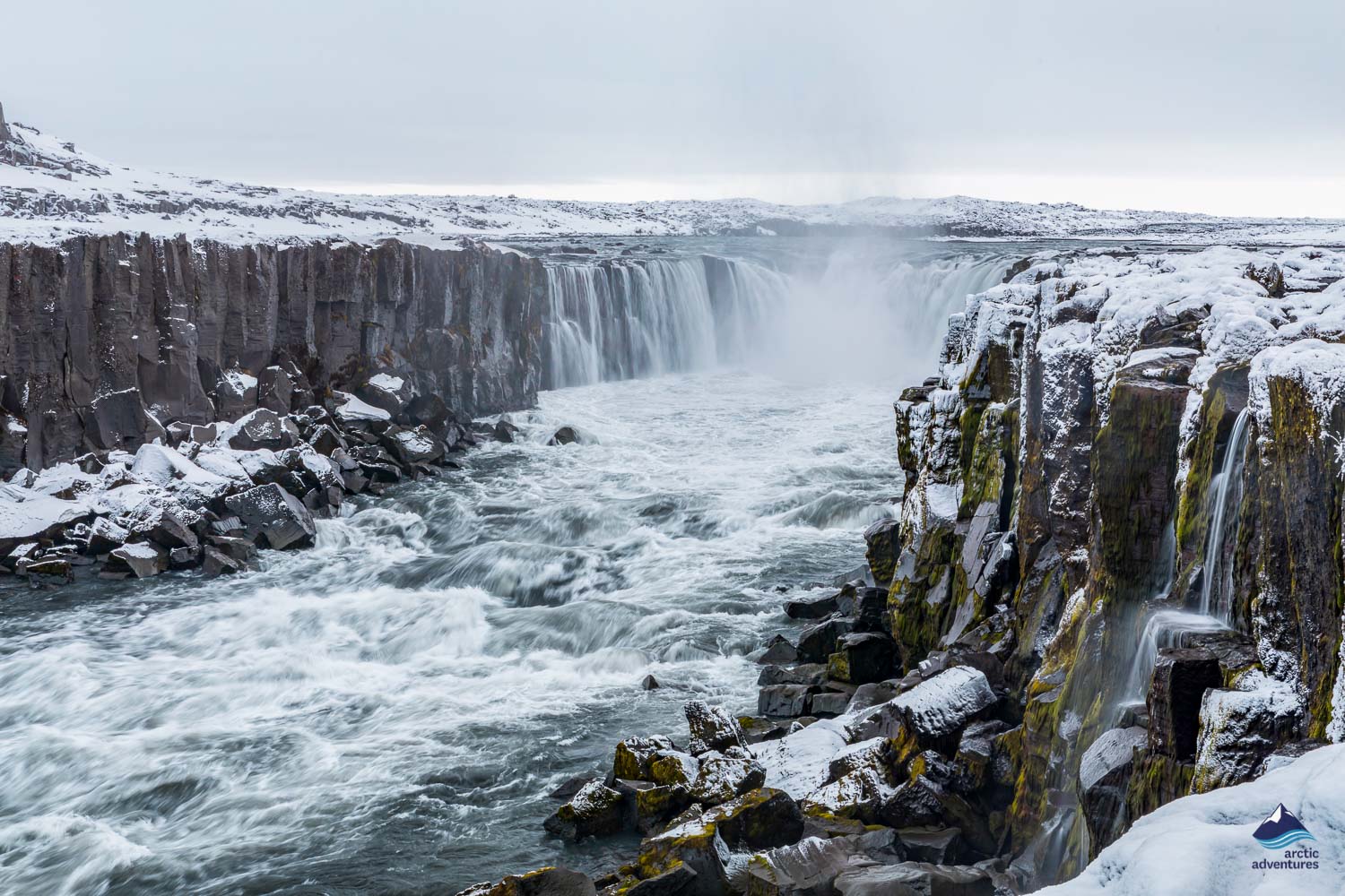 Selfoss se encuentra a tan solo un kilómetro río arriba de la cascada de Dettifoss, y ambas se complementan en una sola visita. A pesar de su cercanía no pueden ser más diferentes: si Dettifoss es una cascada alta y potente, Selfoss es muy baja (apenas 11 metros) pero es muy ancha, alargándose a lo largo de 100 metros, con una visión mucho más panorámica.
