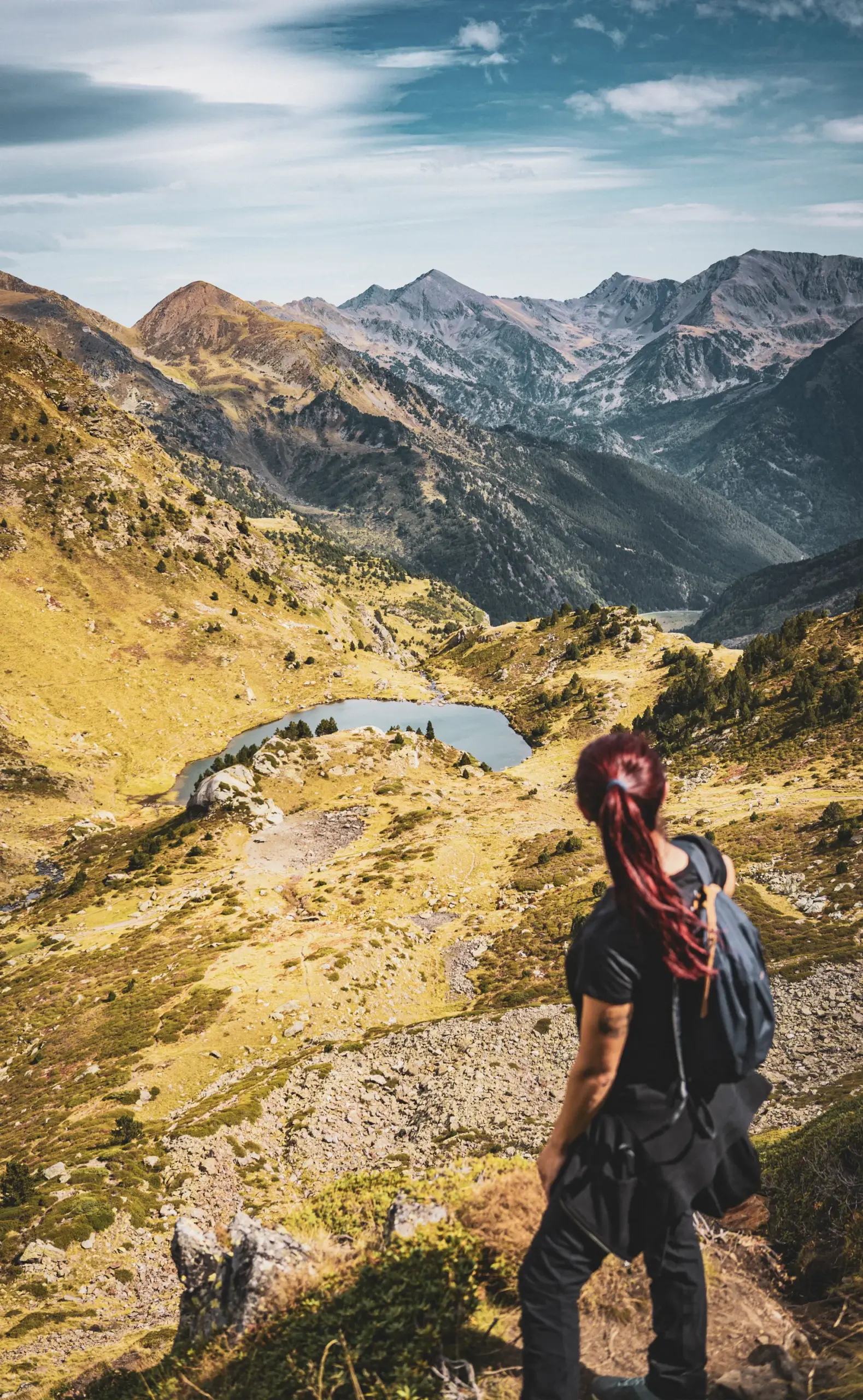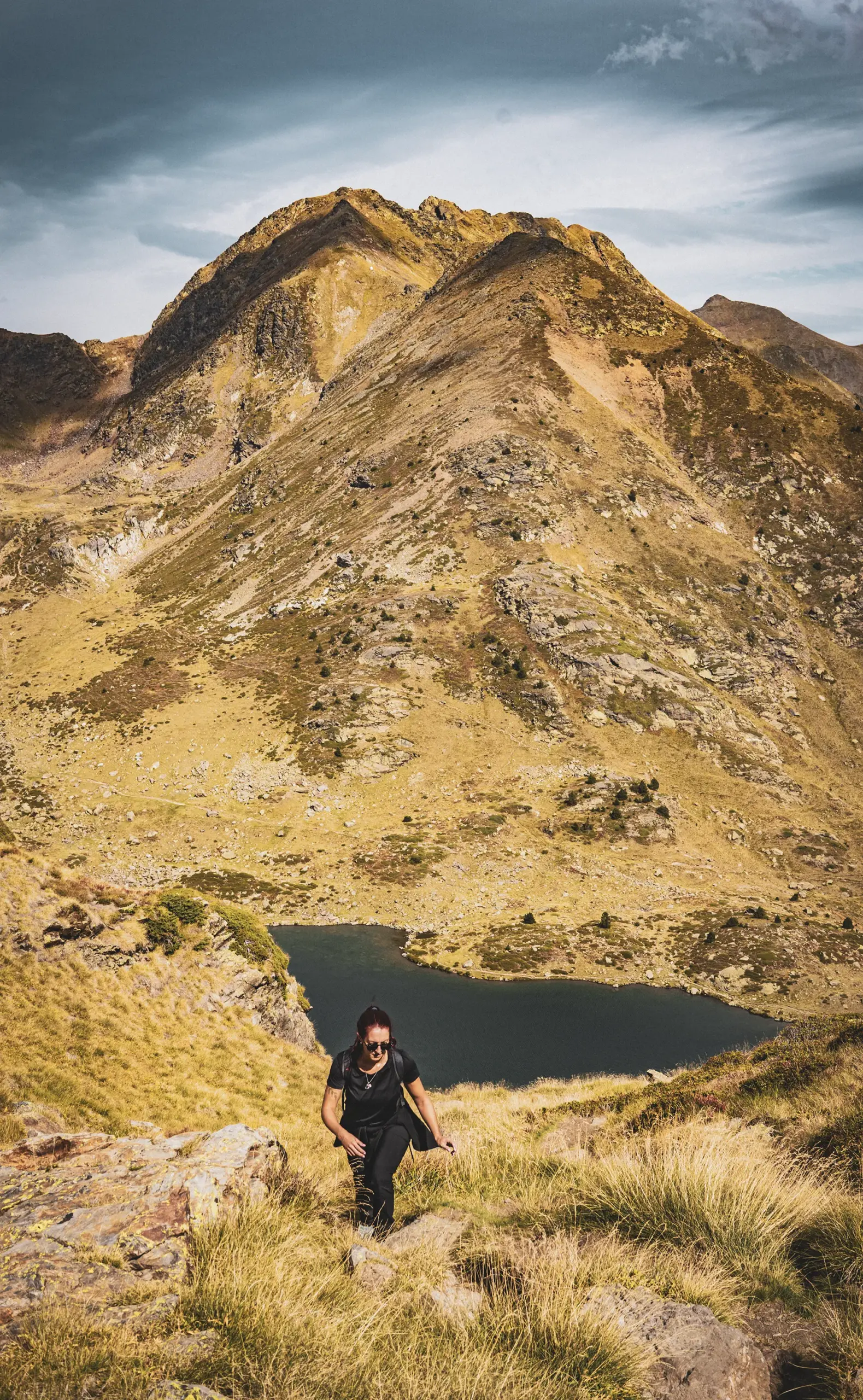Pero si estás haciendo el trekking, desde la orilla sur del Estany del Mig sube decidido un sendero hacia el collado de Creussans, bordeando el Roc del Vaquer. Este es el tramo más fatigoso de la ruta, pues añade casi 400 metros de desnivel positivo en tan solo un kilómetro de ascenso. Sin embargo, es también el más bello del trekking, y me detengo varias veces a fotografiar a mi amiga, que tiene como fondo las impresionantes montañas que rodean a los lagos.
